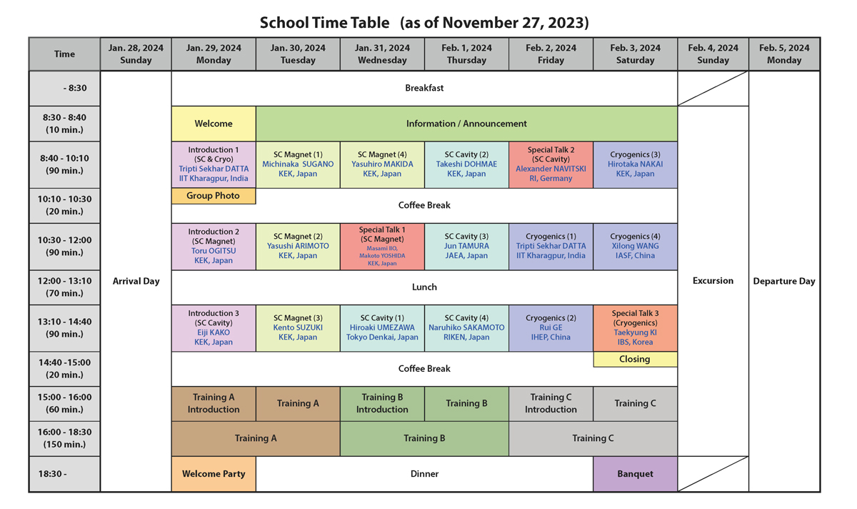 2024年1月28日から2月5日まで、高エネルギー加速器研究機構つくばキャンパスで「第5回アジア加速器用超伝導・低温技術スクール」を開催しました。「アジア加速器用超伝導・低温技術スクール」は、アジア・太平洋地域の国々における超伝導技術や低温工学の専門家を養成するために、若手の研究者・技術者や学生・大学院生にこれらの分野に関する講義および実習を行うことを目的としています。超伝導加速器の設計、建設および運転に必要な超伝導や低温工学に関する講義だけではなく、小グループに分かれ、加速器に関係した超伝導機器および低温工学の実習を行うことを重視しています。これにより、参加者が講義で得た知識を実際の現場で体験し、知識と体験が一体となって理解することができるようになります。