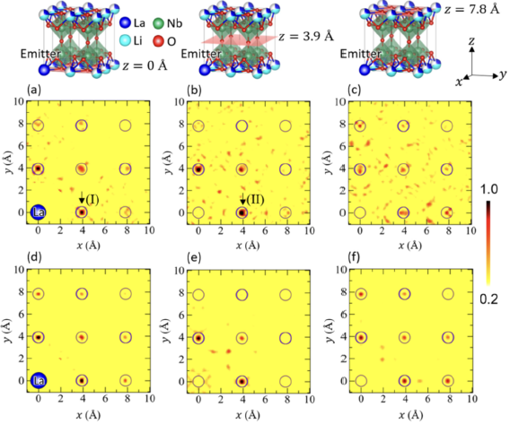 Fig. 1. Atomic images reconstructed from XFH experiments (a-c), and those calculated using the four-column model (d-f). The planes are z = 0 Å, z = 3.9 Å, and z = 7.8 Å. The clear atomic images in the middle panel (z = 3.9 Å, the A2 layer) confirm La3+ occupation in the conventionally "empty" layer.