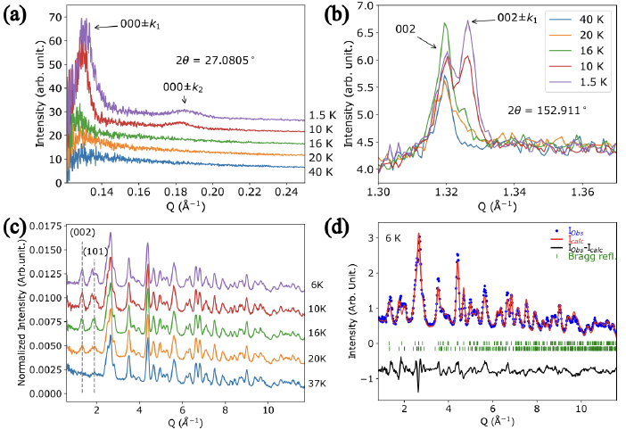 Fig.1. (a) The 000-reflections uncovered by WISH measurements that were used to determine the propagation vectors. (b) The 002 and 002±k-reflections uncovered by WISH, revealing incommensurate structures also present at 16 K and 20 K. (c) Diffraction patterns measured by HRC at the different temperatures. (d) Typical model refinement of the 6 K HRC data using the single propagation vector (0.0741 0 0).