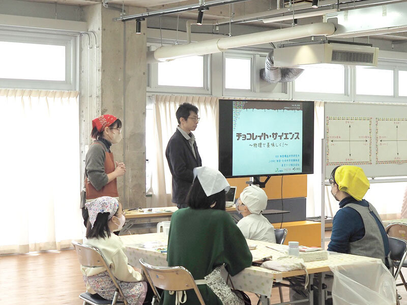 チョコレートを冷蔵庫で冷却する待ち時間には、講師から「チョコレートは“食べる結晶”であり、温度管理によって結晶の形が変わること」、そして「より簡単に作るための秘密の方法」についての説明がありました。また、物構研で行われている、中性子ビームや放射光などの量子ビームを使った研究について紹介しました。