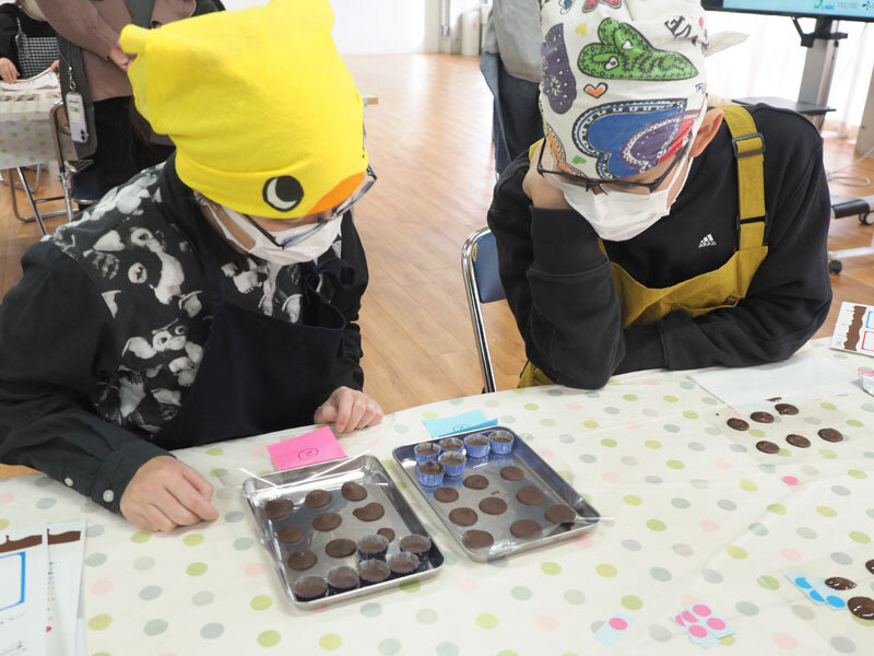 実験の仕上げとして、2種類のチョコレートを観察・試食し、見た目の違い、型からの外れやすさ、香りや味の広がり、食感などを丁寧に記録しました。最後に、結果をチャート図にシールで表現し、各グループで成果を共有しました。どのグループも作り分けに成功し、2つのチョコレートの違いをしっかりと体験することができました。