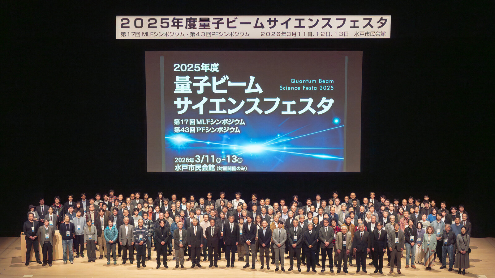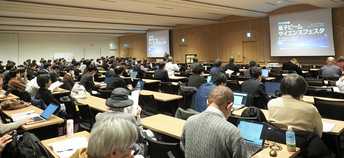 3月11日~13日の3日間、水戸市民会館にて「2025年度 量子ビームサイエンスフェスタ」が開催されました。本フェスタは、放射光・中性子・ミュオン・低速陽電子の四つの量子ビームに関わる多様な分野の研究者、技術者、学生が一堂に会し、情報交換と交流を深めるとともに、将来の量子ビーム利用研究のあり方を議論する場となることを目的としています。主催は、物質構造科学研究所、J-PARCセンター、総合科学研究機構(CROSS)、PF-ユーザーアソシエーション(PF-UA)、J-PARC MLF利用者懇談会です。今回のフェスタには、3日間で約600名が参加しました。