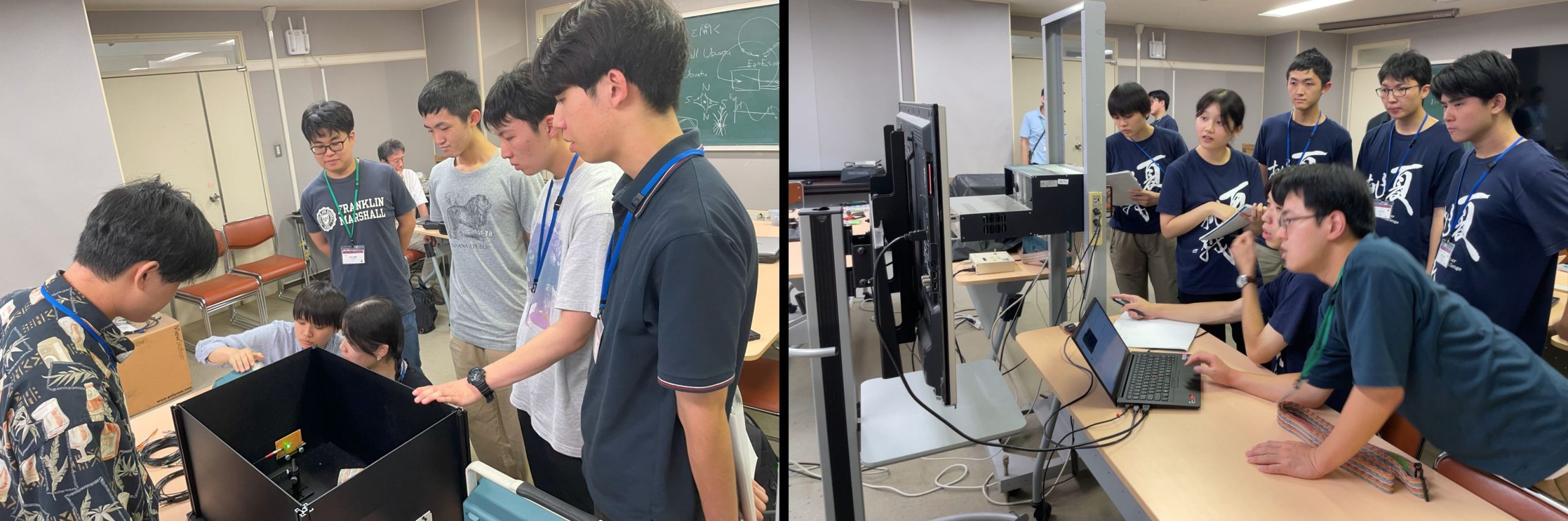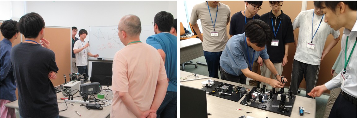 12班は量子コンピュータなどに利用される量子技術を学び、それを応用した高感度センシングを行おうとしています。量子センサーの結晶内の準位遷移について学んでいます(左)。光学定盤の上にレンズや光学フィルターなどのセットアップを組んでいます(右)
