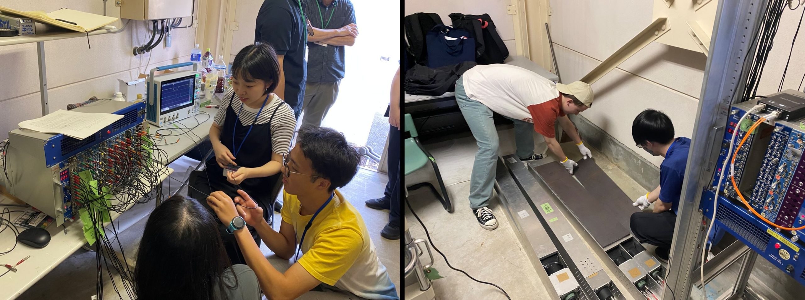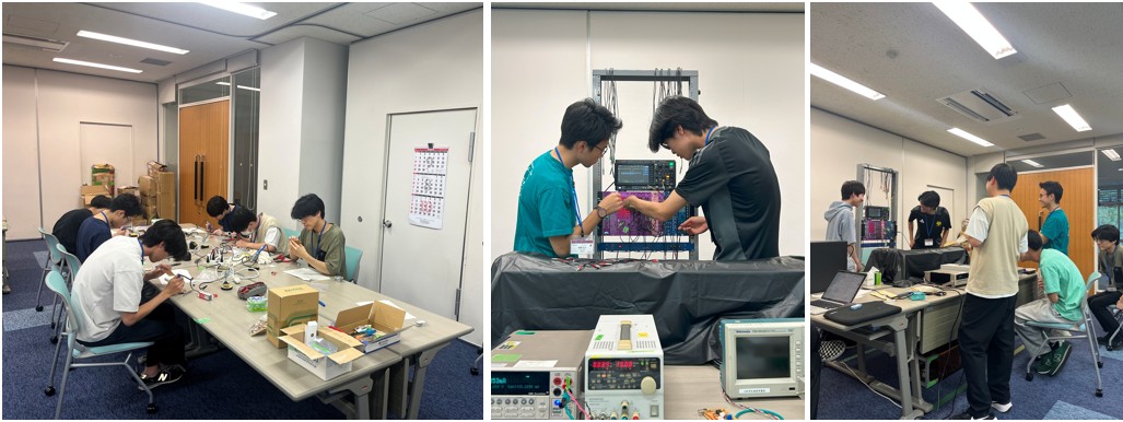 10班は宇宙線ミューオンを使って弱い相互作用の対称性の破れを使った測定を行います。信号読み出しの基板を自作しています(左)。検出器からの信号をオシロスコープで確認しながら、回路モジュールの調整を行なっています(中央・右)