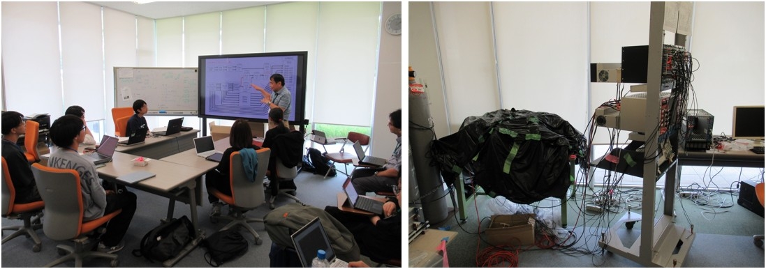 7班は、宇宙線ミューオンの崩壊をとらえてミューオンスピン回転の測定を目指します。数台のモジュールを使って、検出器の信号処理や論理回路の構成を行なっています(左)。宇宙線ミューオンを計測するためのカウンターを積層しています(右)