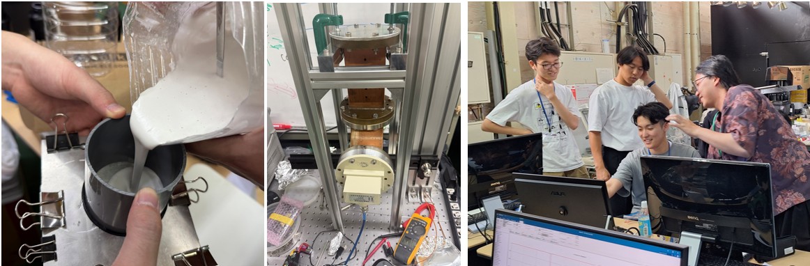 3班では、加速器の原理を学んだあと、実際に自分たちで加速空洞を作ります。3Dプリンターによる鋳造のために樹脂で型を作っています(左)。加速空洞内の磁場を測定しています(中央)