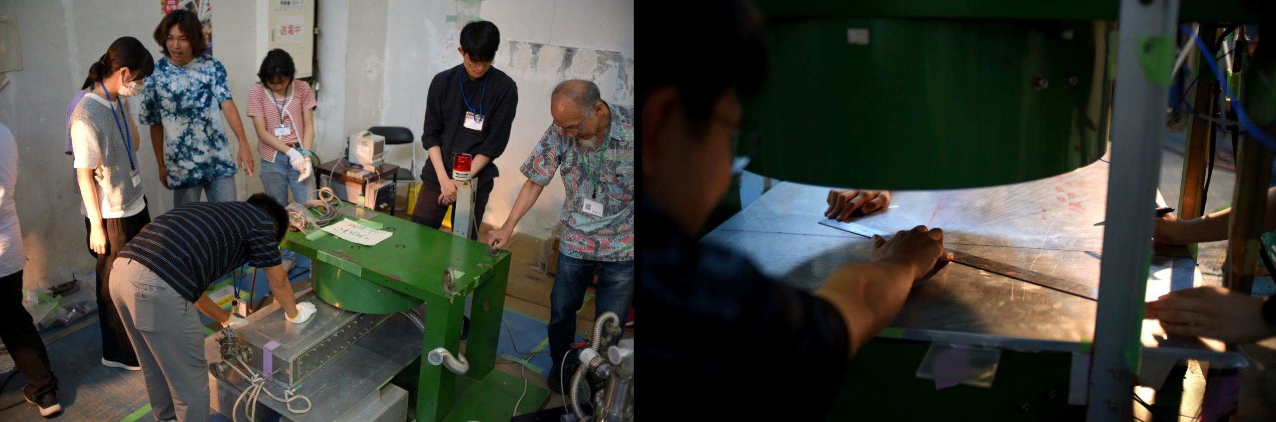 4班では磁石を立ち上げて磁場の中での荷電粒子の振る舞いを調べます。円形電磁石の下に真空槽をセットしています(左)。荷電粒子の運動量を変化させた焦点距離を計算し台座に記しています(右)