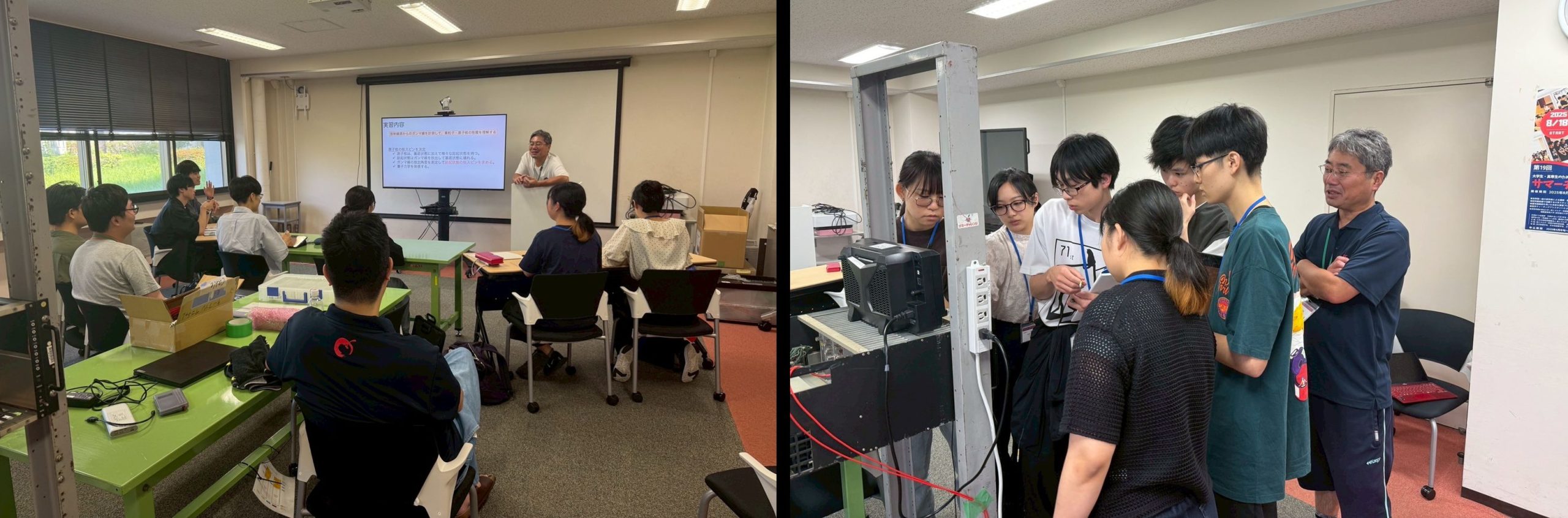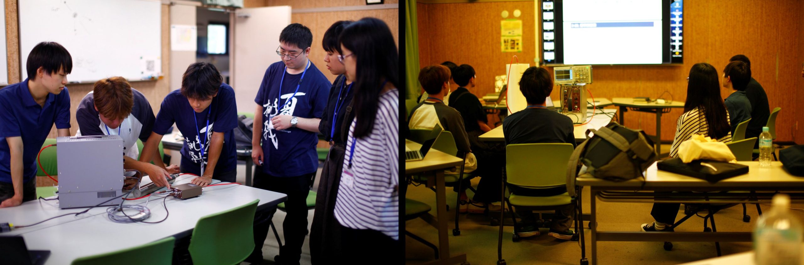 5班は、放射線源からのガンマ線を測り、素粒子・原子核の性質を理解します。まずは演習の内容や測定原理について座学を行なっています(左)。オシロスコープで検出器の信号を確認中(右)