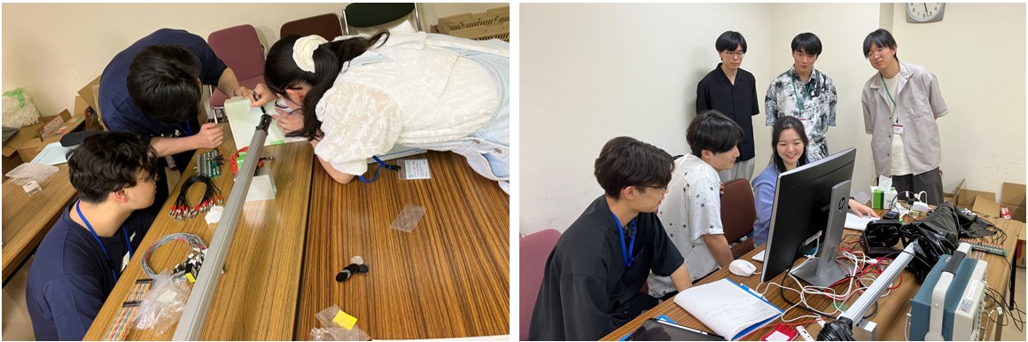 一人一人手作りしたワイヤーチェンバーを使って宇宙線の測定を行いました。金属の細いワイヤーをスプールから引き出しています(左)。 二手に分かれて検出器からの信号を確認中(右)