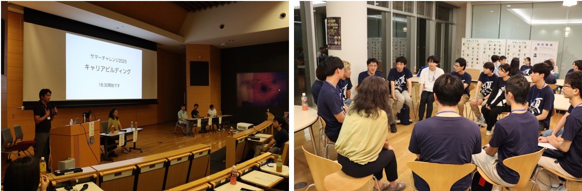 毎年恒例のキャリアビルディングも行いました。このプログラムは様々な分野で活躍する研究者や社会人をパネラーに迎え、対話を通じて進路を考えるきっかけ作りを目的としています。今年は、関口 哲郎素核研准教授の進行で5名のパネラー陣によるキャリア形成をテーマとしたパネルディスカッションの後、参加者との座談会を行いました。座談会では、海外の大学院への進学について具体的な質問がありました。また、「自分に研究の能力があるのか」という不安に対してパネラーが「問題を解くよりも、問題を変えていく能力が大切」と伝える場面がありました。