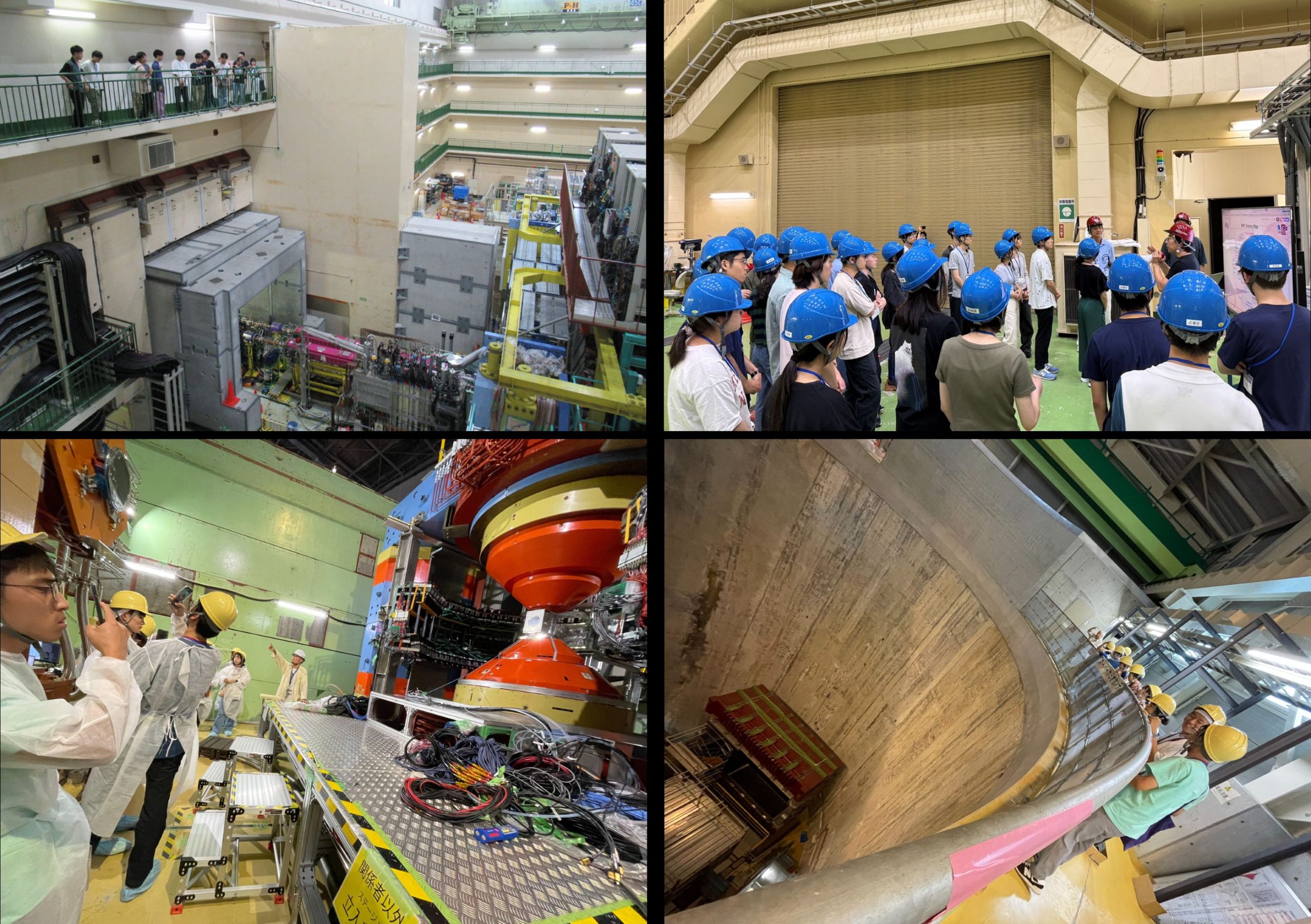 上段)つくばキャンパスでの施設見学。下段)東海での施設見学。間近で加速器や検出器を見ながら研究者からの説明を聴く貴重な機会です