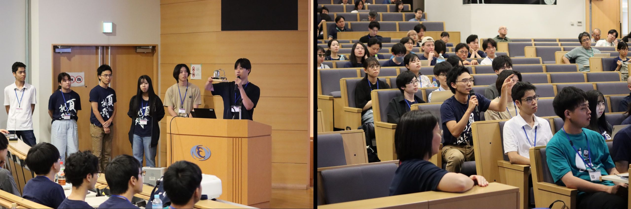 最終日には、各演習班による発表会が行われました。発表会に向けて、それぞれの得意な面を活かして仲間同士協力し合い、時には白熱した議論をしながら自分たちで作った検出器などの装置を使った実験の結果と考察をまとめて発表しました。どの班の発表に対しても、他班の参加者から、測定の手法や実験の条件、考え方について鋭い質問が寄せられました。