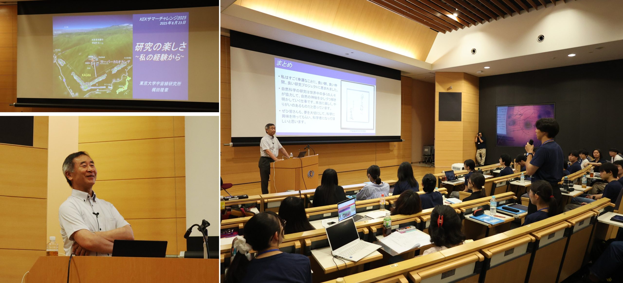 サマチャレでは毎回著名な物理学者による特別講演を実施しています。今年は、2015年にノーベル物理学賞を受賞された梶田 隆章氏(東京大学 卓越教授、宇宙線研究所教授)が「研究の楽しさ」と題し、ご自身の学生時代からの経験を交え、カミオカンデ建設から現在に至るまで、ニュートリノ研究についてわかりやすく講義を行いました。梶田教授は「カミオカンデという自分にあった実験に出会えたことが非常に幸運だったと思います。言わば人生を変える出会いでした」「一つの事が発見されると他の問題解決の糸口が見つかることが科学研究の楽しさ」と語りました。参加者からは、「実験でやりがいを感じることは?」「研究者は誤差をどう処理するのか」などたくさんの質問が寄せられました。
