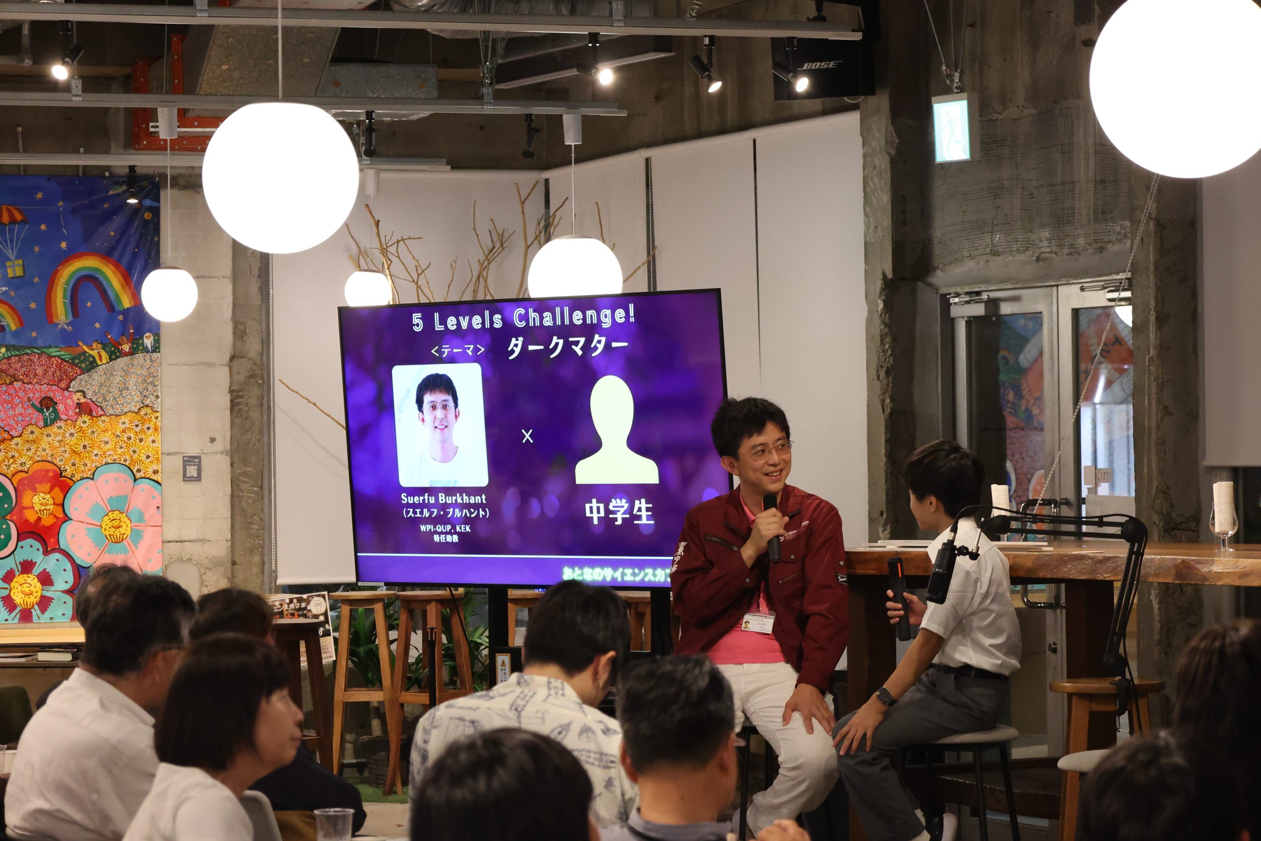続いて、KEKとして初めての企画「5 Levels Challenge!」。小学生、中学生、社会人、大学院生、エキスパートの5人を相手に、それぞれの理解度に合わせて「ダークマター」を1対1で説明するという難題に、 WPI-QUPのスエルフ特任助教が挑戦しました。参加者は、「ダークマター」の存在ががどのように見つかったのか、なぜ重要なのかなどについて、小・中学生むけのかみ砕いた説明に納得したり、専門家との研究会の一コマのような深い議論にキョトンとしたり、分かることも分からないことも楽しんでいただけたようでした。説明役のスエルフ特任助教にとっても、自分の研究をいろいろな角度から見つめ直す良い機会になったようでした。