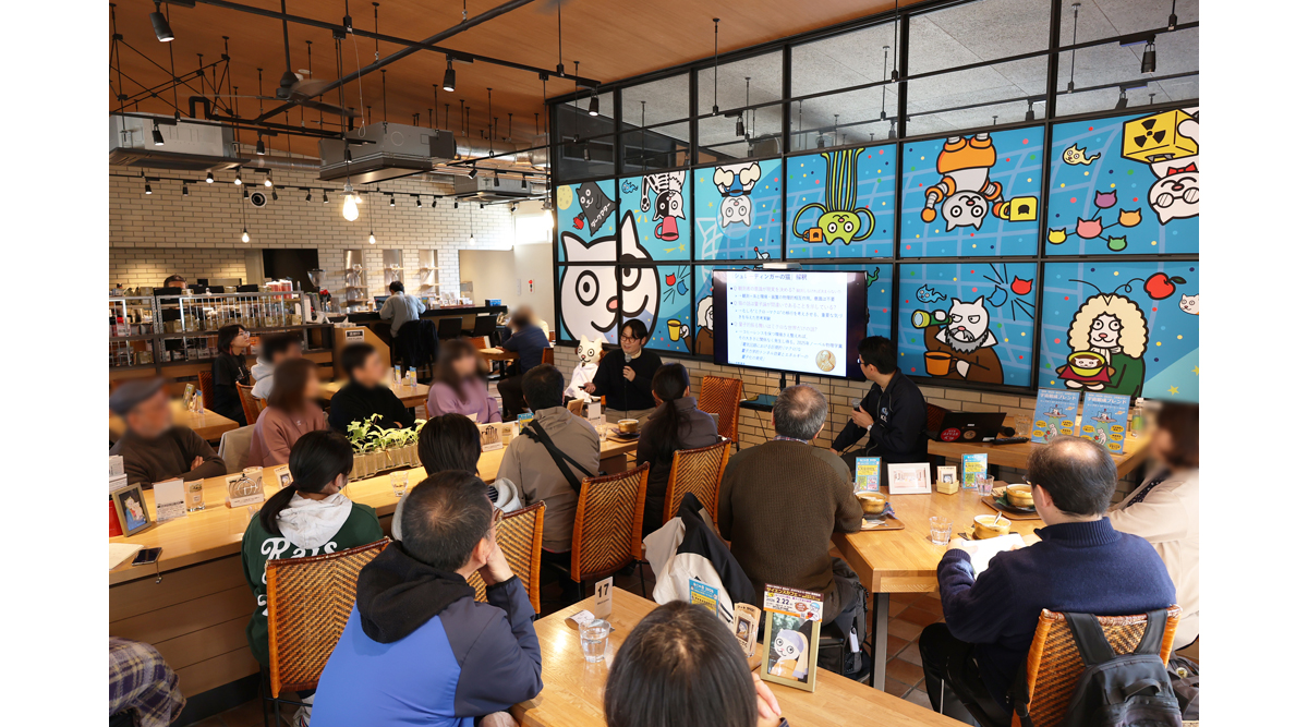 On Sunday, February 22, 2026 Associate Professor Yuji Chinone of the International Center for Quantum-field Measurement Systems (WPI-QUP, KEK) delivered a public talk titled “Unveiling the Secrets of Quantum Physics and the Universe on Cat Day” at a science café held at Saza Coffee Tsukuba University Alliance Branch.