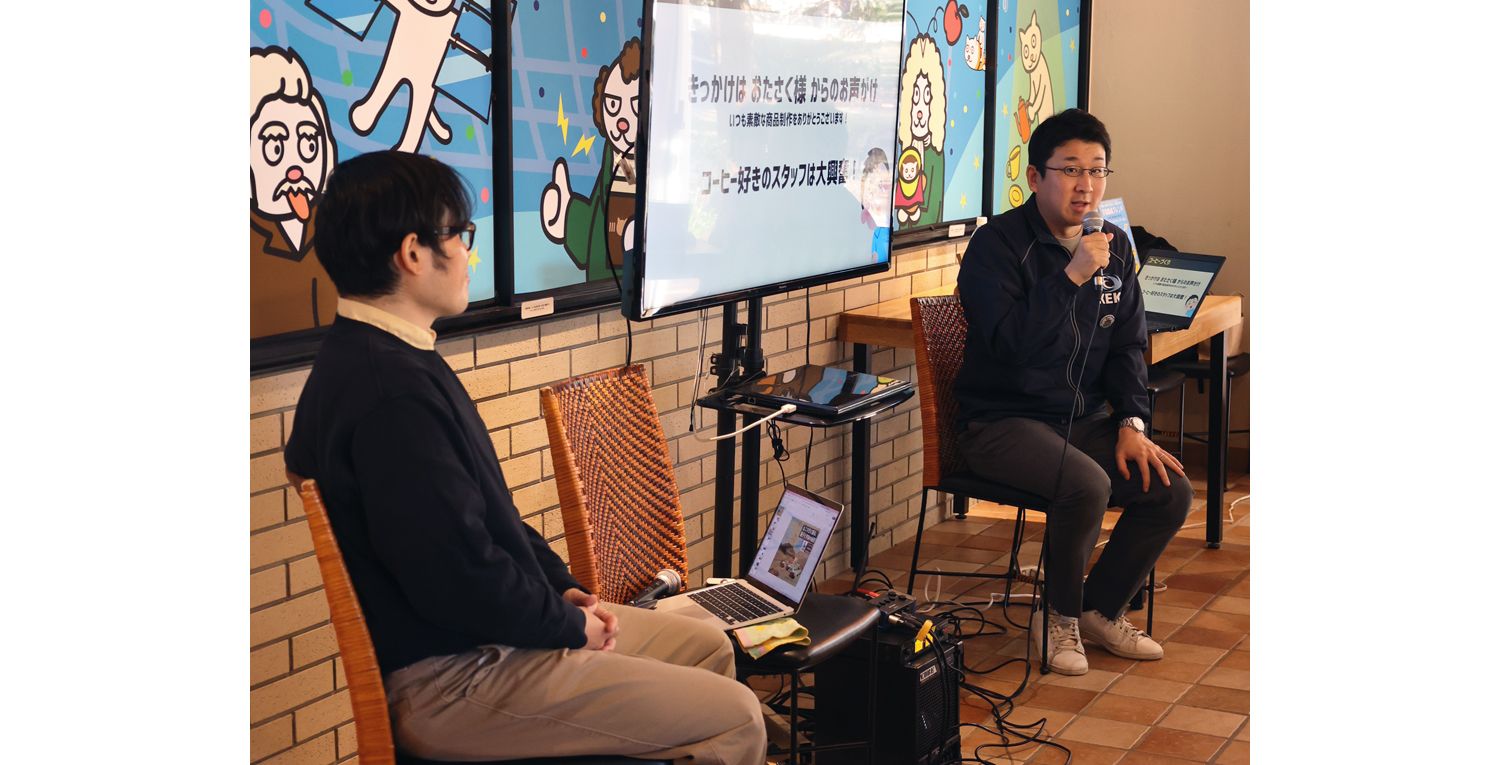This science café event was organized to commemorate the launch of a six-pack set of drip coffee bags featuring the original blend “Cosmic Composition Blend.” Created in 2025 through a collaboration between the High Energy Accelerator Research Organization (KEK), Saza Coffee, headquartered in Hitachinaka City, Ibaraki Prefecture, and OTASAKU Shoji, a company producing a wide range of original goods mainly in Ibaraki, this special blend symbolizes the composition of the universe. For this event, a newly designed package was introduced, and the special-edition six-pack set went on sale on February 22, known in Japan as “Cat Day.”
