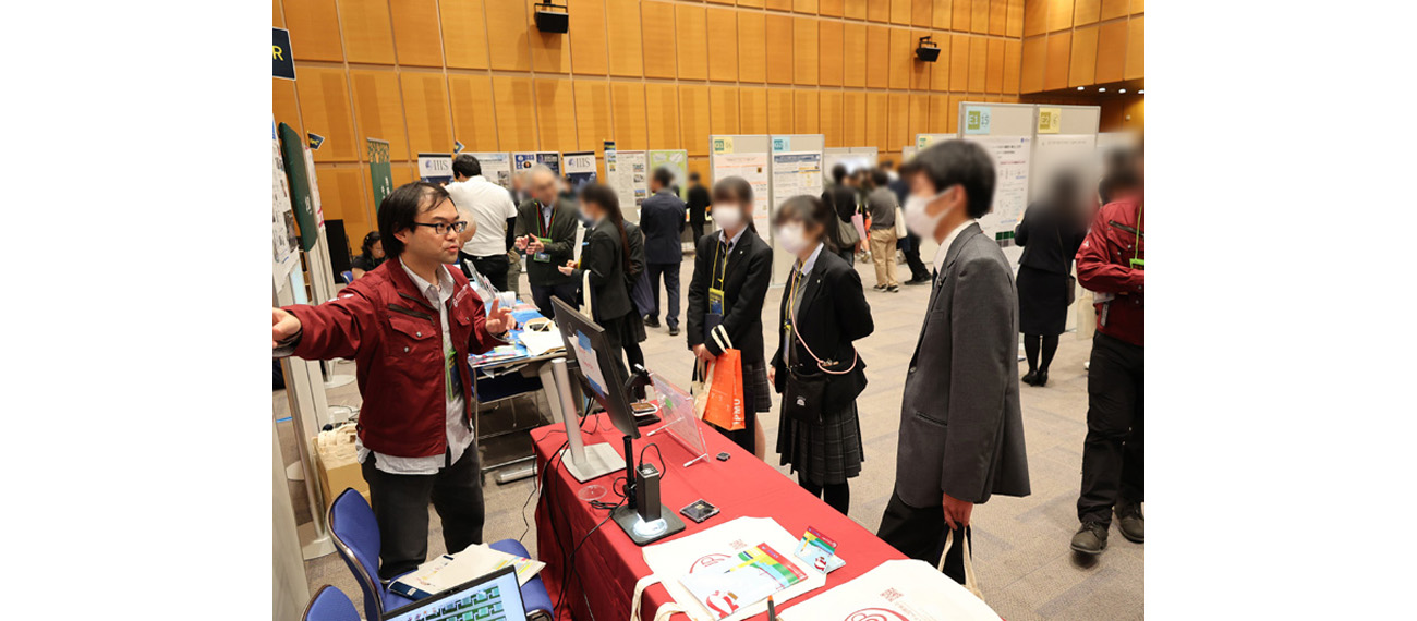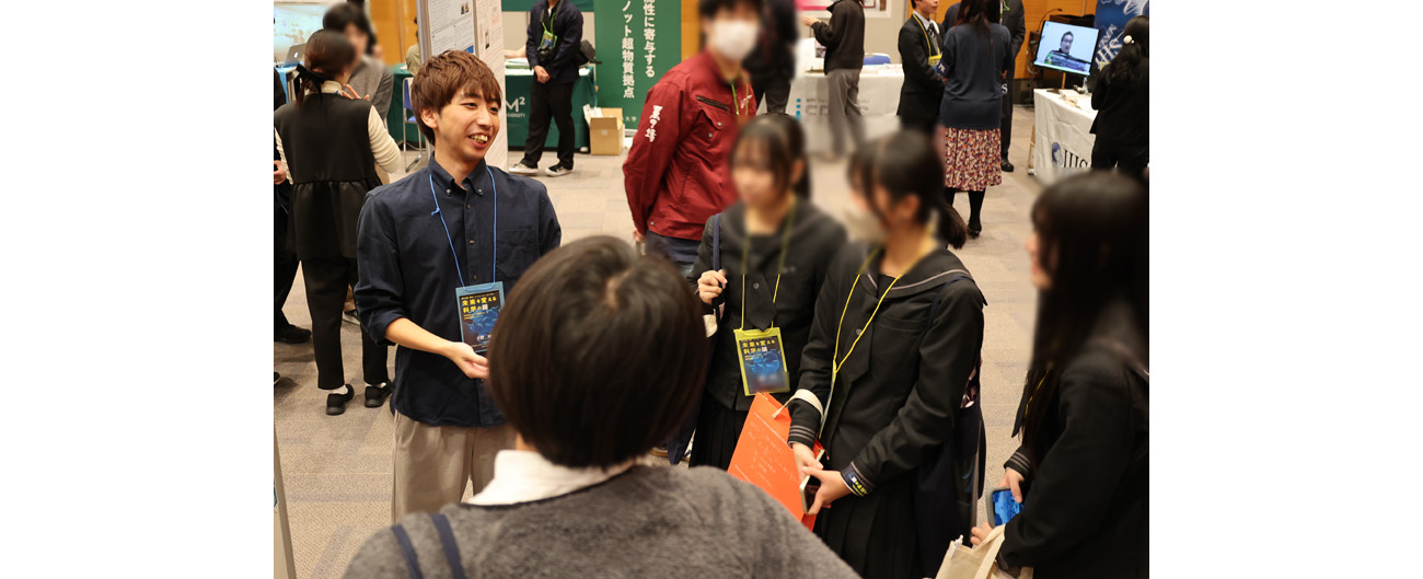「高校生ポスター発表会」のあとには、昼食休憩をはさんで各WPI拠点から選ばれた18名の若手研究者による「研究者ポスター発表会」が行われました。高校生参加者が研究者に質問したり、メモをとったりしながら交流する様子も見受けられました。また、発表会の時間帯にはWPI各拠点の活動を紹介するブース展示も行われ、参加者との活発な意見交換が行われました。