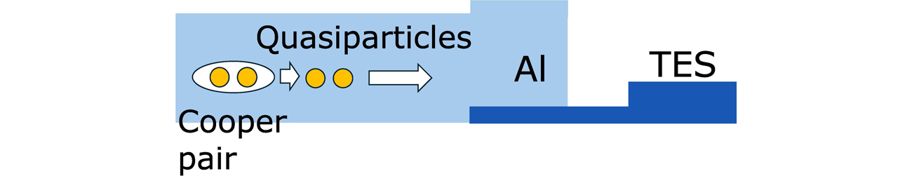 図1:超伝導材料内でダークマターの物質の相互作用で励起された準粒子が、TES検出器で検出される仕組みの概念。