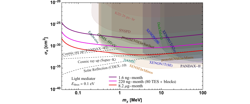本研究は、現実的な検出器の応答モデリングと物質内における暗黒物質相互作用の詳細な理論計算を組み合わせています。検出器性能の詳細と素粒子物理モデルの両方をきちんと考慮することで、TES検出器を使ったダークマター探索感度を包括的に評価する枠組みを提供しています。ダークマターの探索は、他の量子センサーによる実験や宇宙観測をもとにした研究など、世界中でたくさんの戦略で進められています。図2は、この研究の代表的な結果で、ダークマターと検出器中の電子が衝突する場合のTES検出器での実験でどれだけの感度が出るかを示しています。この研究は QUPをはじめとする各機関における検出器開発の最近の進展を見据えて、こうした技術が将来の探索にどのように拡張できるかを示しています。